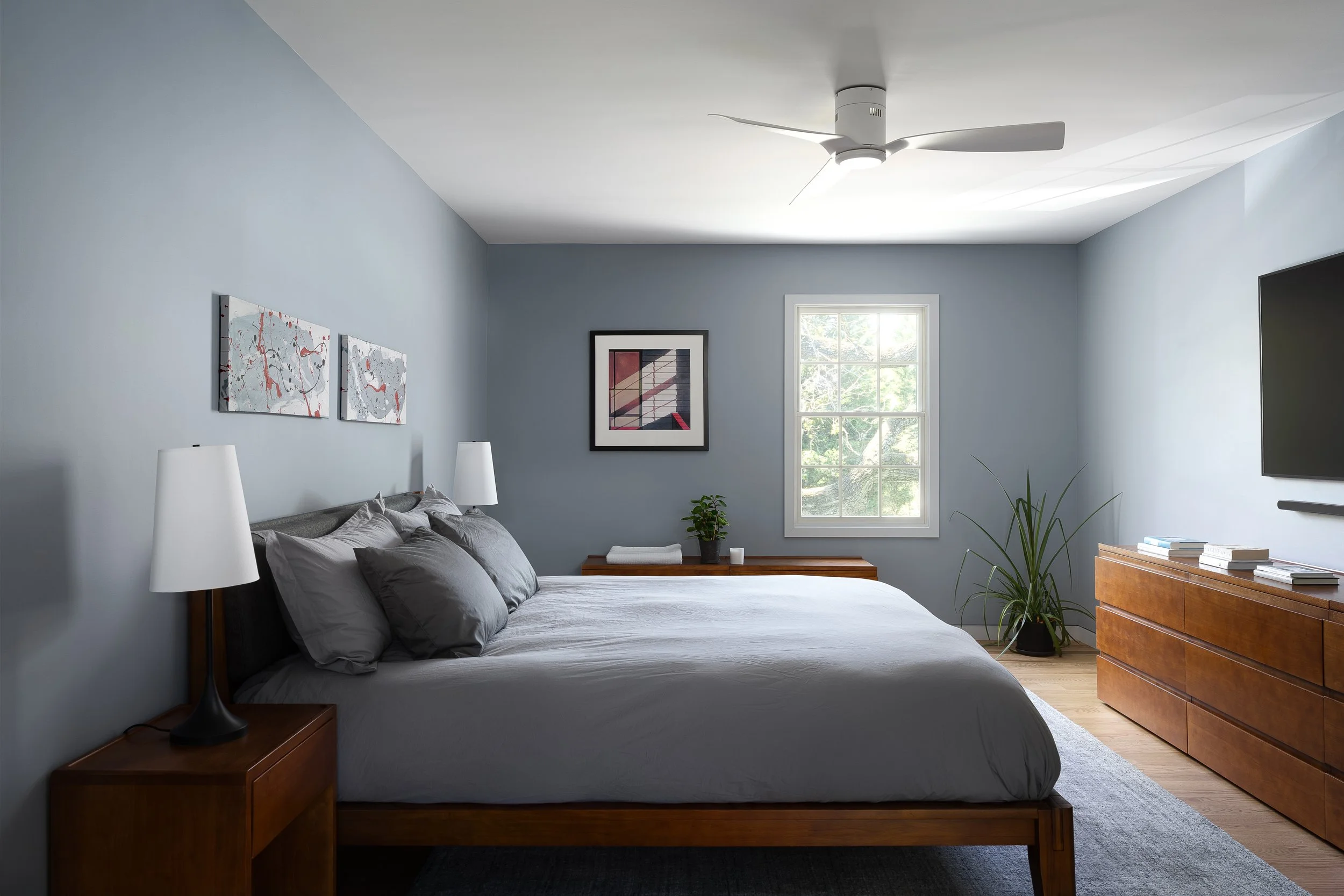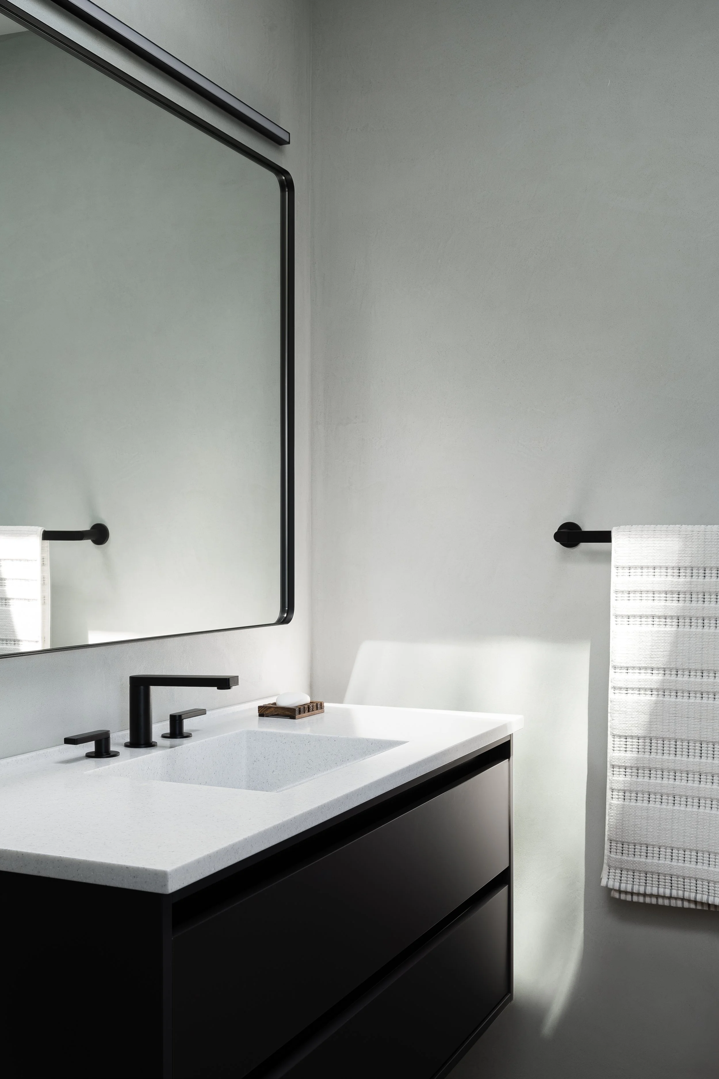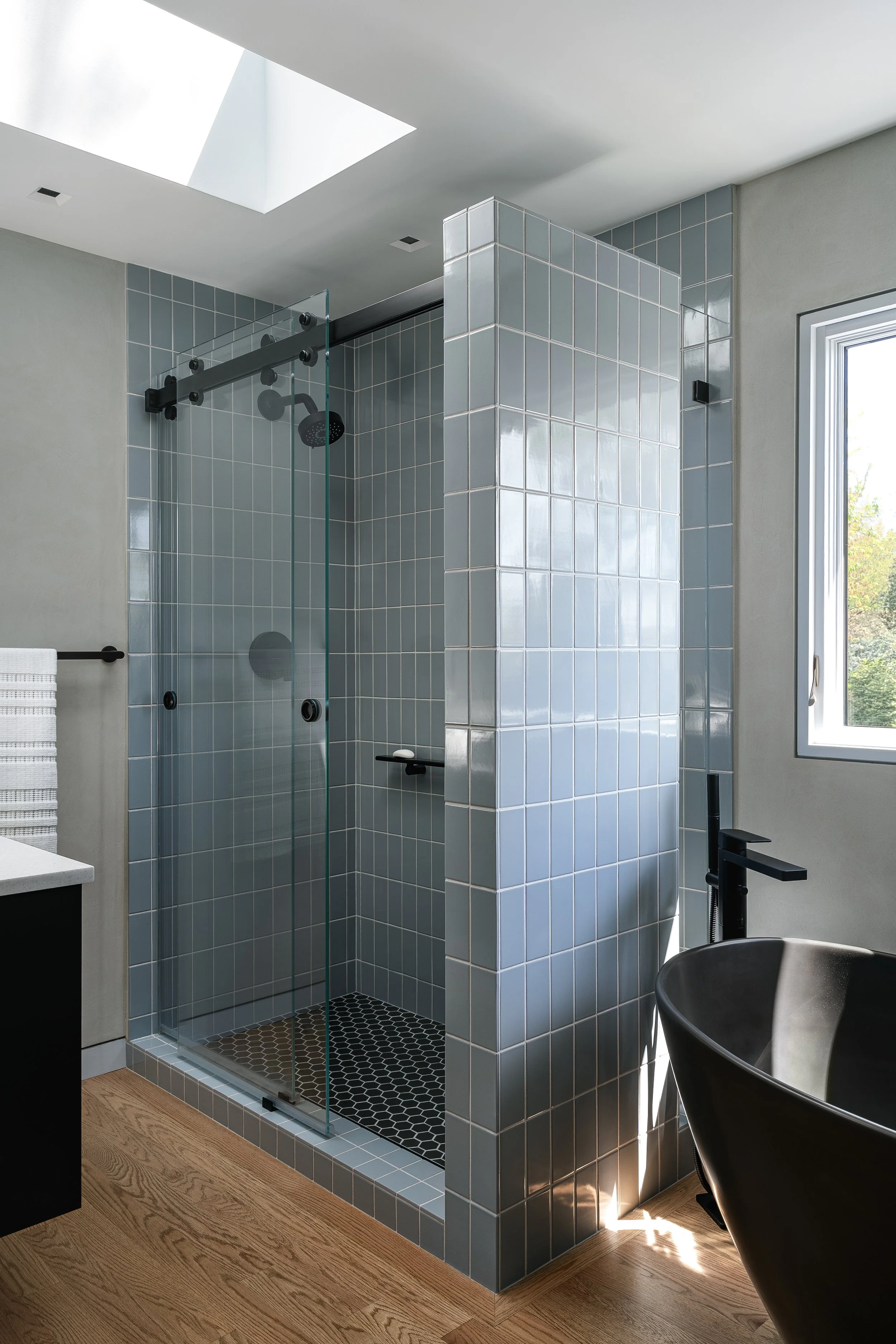The Fairfax bathroom remodel reimagines an existing bathroom to feel larger without adding square footage. The walls are finished in a custom-colored clay plaster which passively moderates excess moisture levels by absorbing and releasing humidity introduced when showering or bathing. All of the switches, outlets, and light fixtures are inset with trimless flanges that could be plastered over. We recessed the baseboards to sit flush to the plaster walls with a reglet reveal and painted the supply air vents to match the plaster to be as unobtrusive as possible. Design decisions included bringing in more natural light, carrying the wood floors from the bedroom and utilizing a hallway to make space for both the custom tiled shower enclosure and freestanding tub.